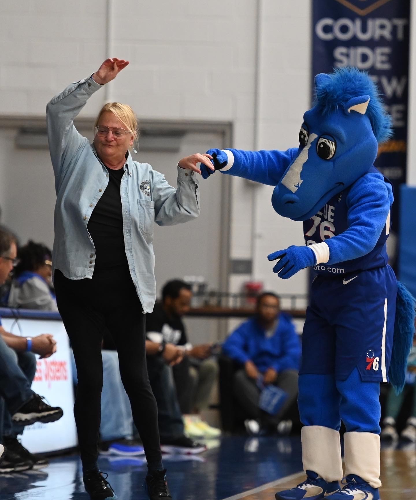 Delaware Blue Coats mascot dances with a fan duing a game, Photo courtesy of Ben Fulton Nick Halliday November 23, 2023