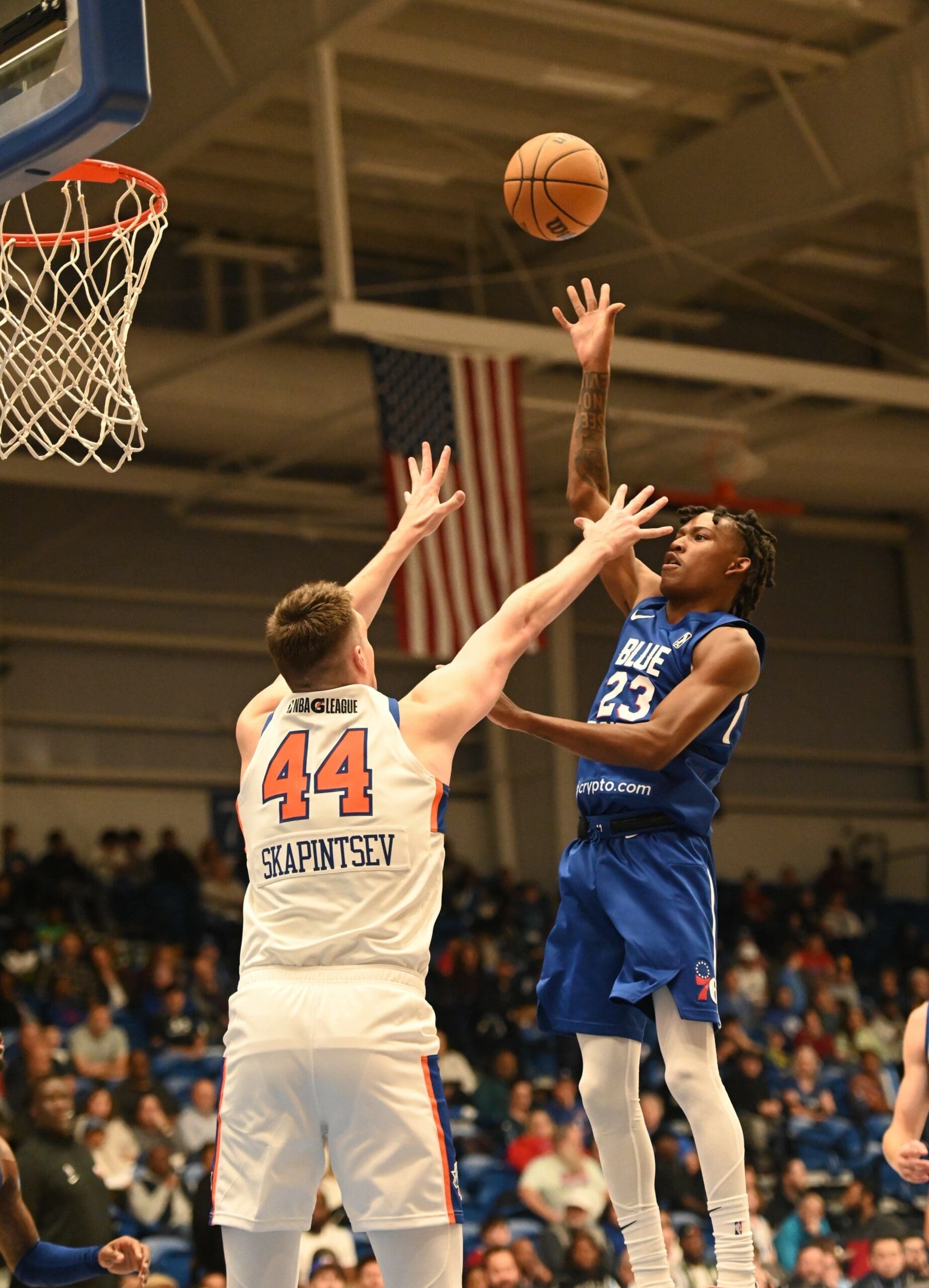 Delaware Blue Coats Terquavion Smith takes a shot during their home opener, photo courtesy of Ben Fulton Nick Halliday November 11, 2023