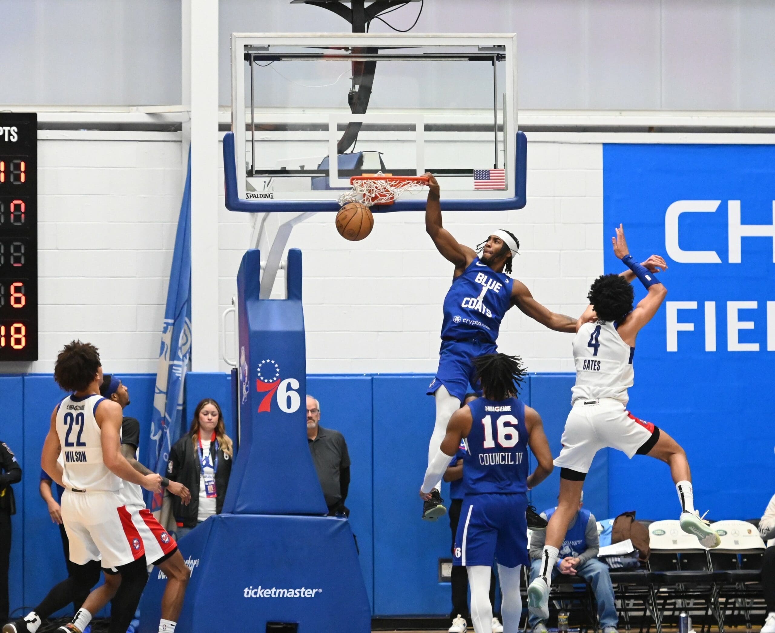 Delaware Blue Coats David Duke dunks the ball against Long Islanad Nets, photo courtesy of Ben Fulton Nick Halliday November 30, 2023
