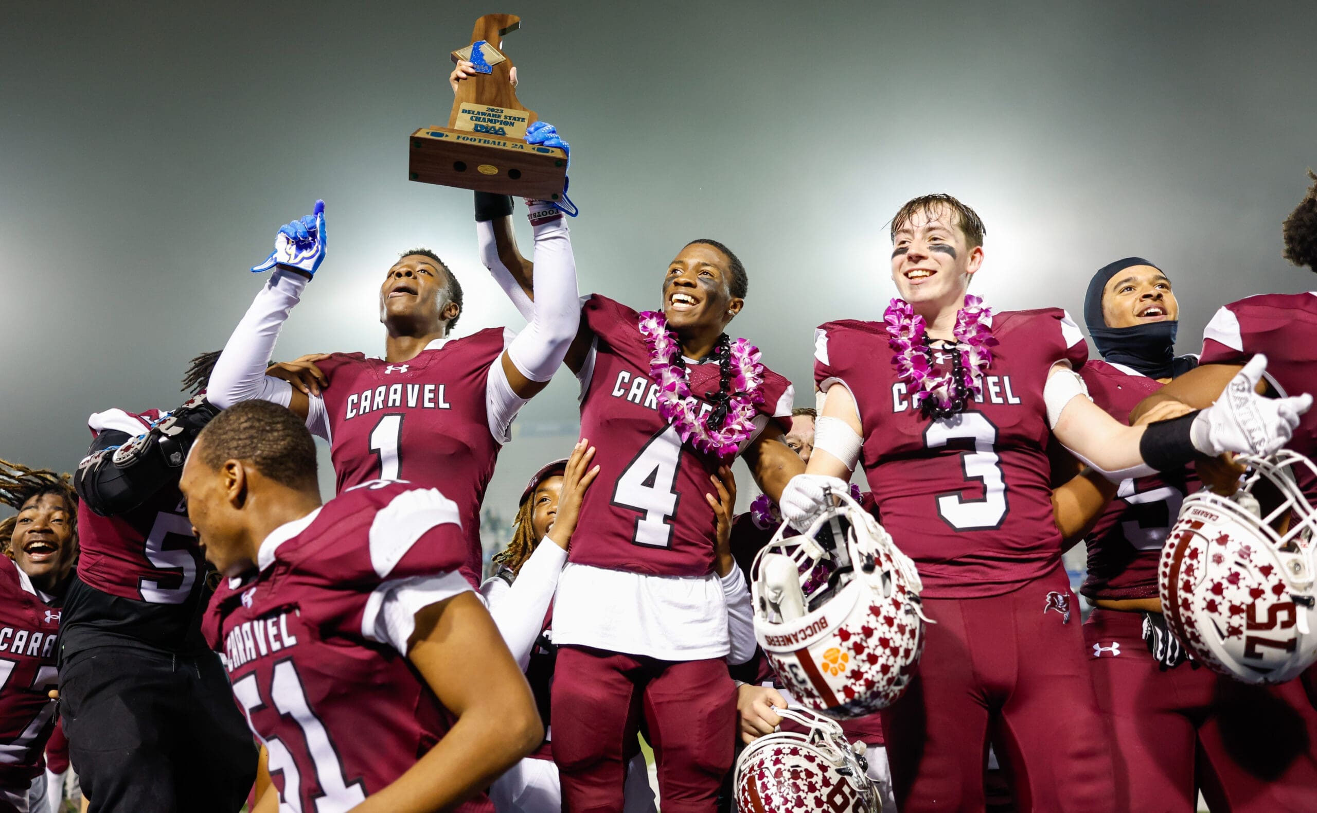Caravel football poses with the trophy after winning the DIAA 2A football state championship, photo courtesy of Donnell Henriquez Nick Halliday December 3, 2023