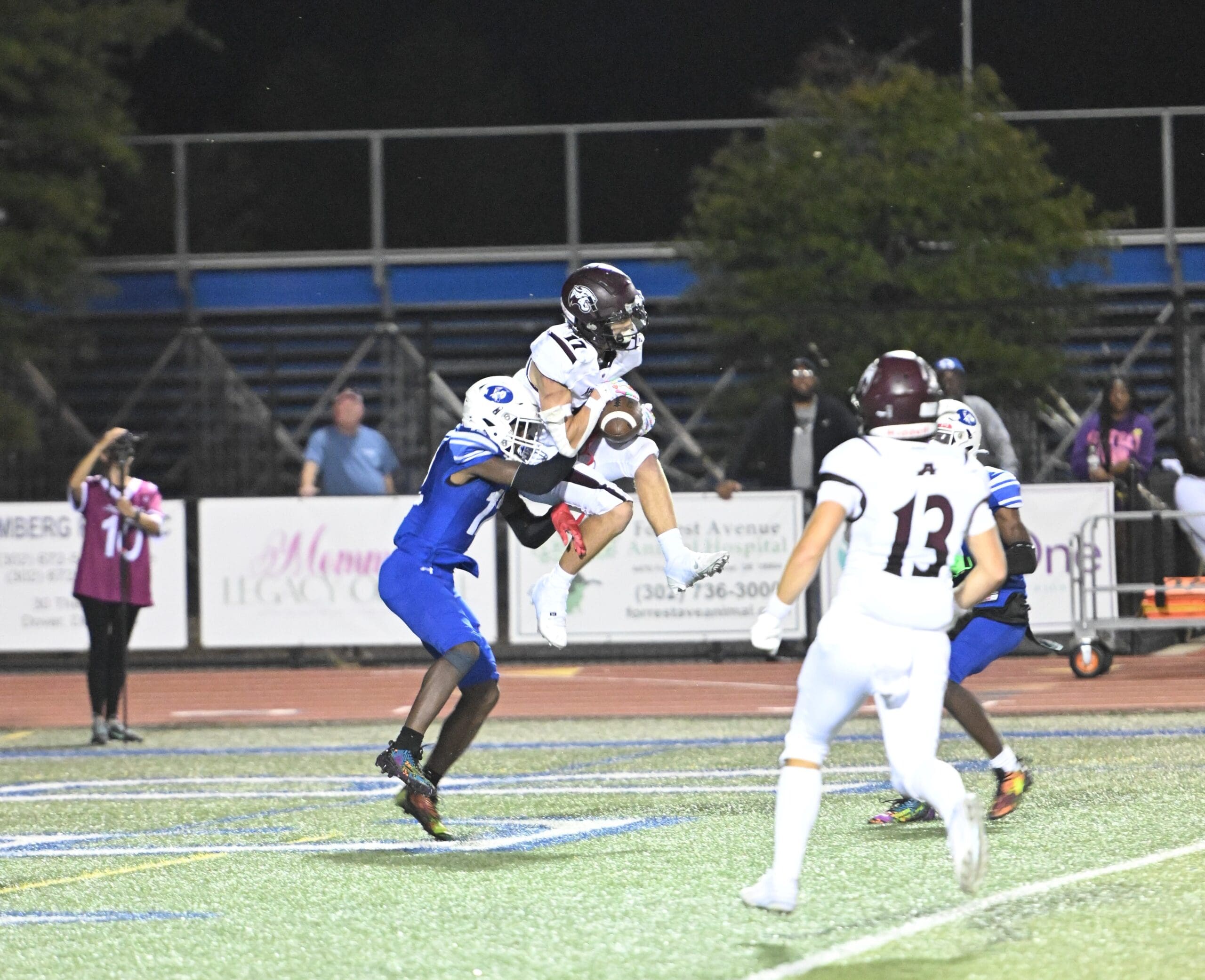Appoquinimink football Noah Hoff catches a touchdown pass in their win over Dover. Photo by Ben Futon Nick Halliday September 14, 2024