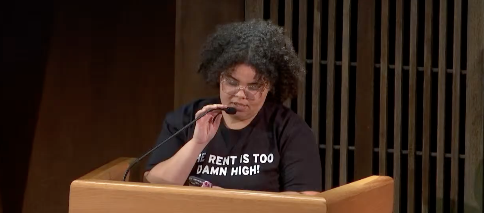 Cheyenne McGowan resident of the 5th District, commenting in favor of rent stabilization wearing a T-shirt with the phrase “THE RENT IS TOO DAMN HIGH!”