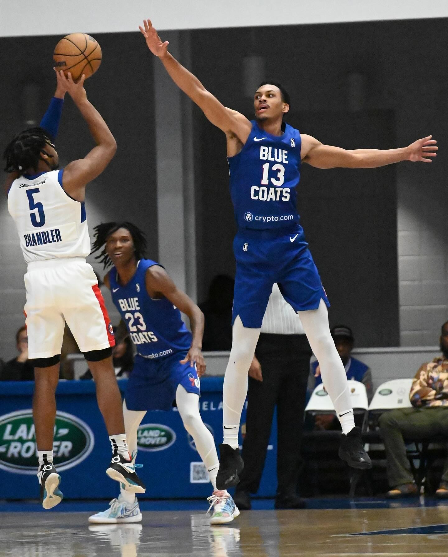 Delaware Blue Coats Darius Bazley attempts to block a shot, photo courtesy of Ben Fulton Nick Halliday December 17, 2023